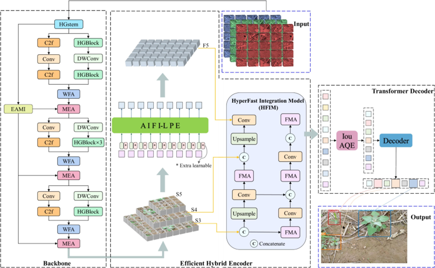 该研究针对玉米田间杂草分布复杂、目标尺度多样、遮挡严重以及在边缘设备上实时检测难度大等问题,提出了一种面向边缘设备的轻量级实时Transformer杂草检测框架RT-MWDT,通过融合轻量级双主干网络与杂草融合对齐模块,显著提升多尺度特征对齐能力并减少参数量;设计多阶段边缘驱动检测模块,增强对小目标和模糊边界的识别能力;引入超快速融合模块与可学习位置编码的注意力交互机制,进一步提升遮挡环境下定位精度。实验表明,RT-MWDT在玉米田间杂草检测中达到87.3% AP₅₀和58.4% AP₅₀–₉₅,推理速度较RT-DETR提升83.1%,在Jetson Orin NX等边缘设备上仍能保持30 FPS以上的实时性能,为精准农业中的智能除草作业提供了高效可靠的视觉解决方案。