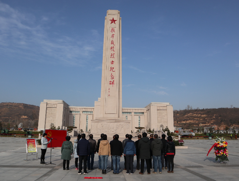 在扶眉战役纪念碑前,全体人员高唱中华人民共和国国歌、脱帽向烈士默哀、献花篮、向革命烈士三鞠躬、教师党员重温入党誓词等环节,接受了革命先烈的精神洗礼,表达了对革命先烈的深切缅怀和崇高敬意。