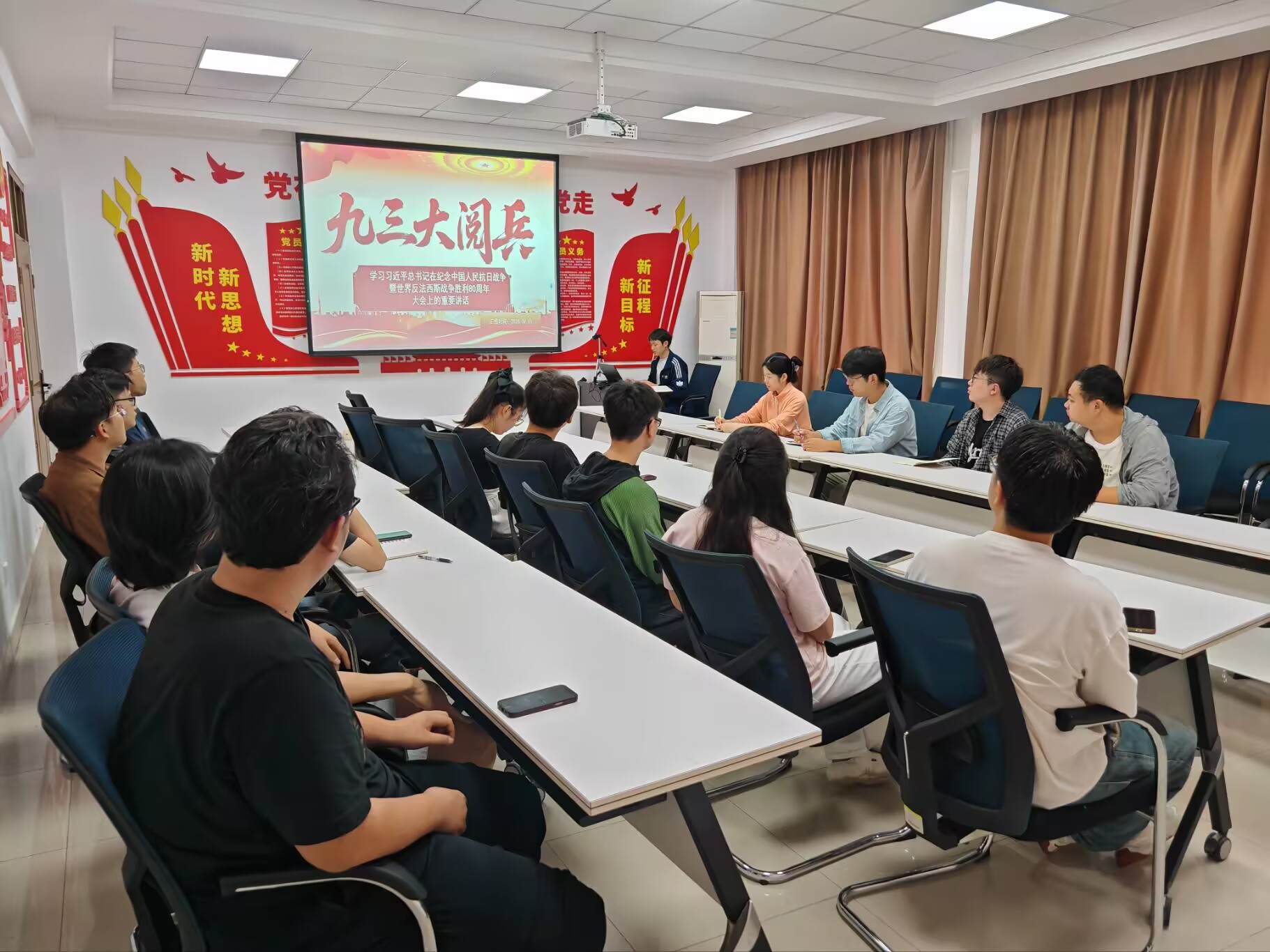 为深入学习习近平总书记在纪念中国人民抗日战争暨世界反法西斯战争胜利80周年大会上的重要讲话精神,专硕第三党支部于9月11日下午在动漫狂 9331会议室,组织全体党员同志开展专题学习会。支部组织委员王弘坤同志通过“图文+视频”形式,深刻剖析习近平总书记讲话精神,引导支部全体党员从历史中汲取奋进力量,凝聚起以中国式现代化推进民族复兴的强大动能。