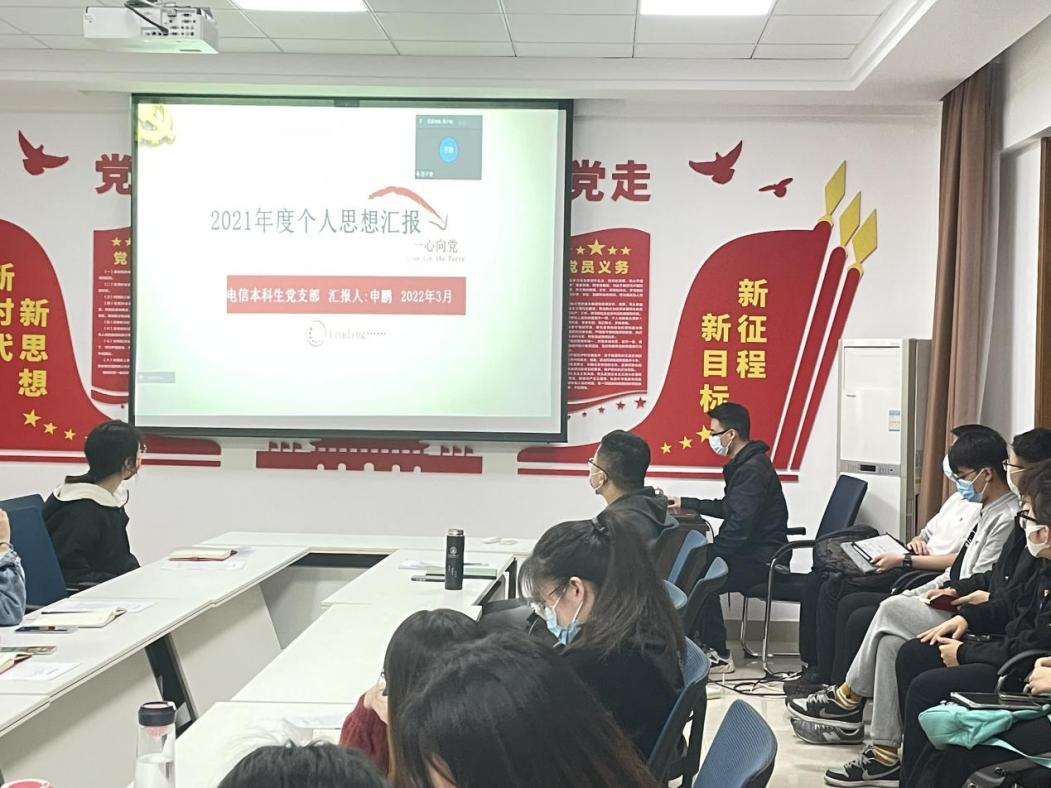 首先,李晶同志向支部同学们传达了会议精神,并简要介绍了会议流程。接着,李晶同志代表电信本科生党支部就2021年工作做了述职报告,详细讲述了支部这一年的基本情况,包括党员同志的个人工作以及党支部获奖情况;梳理并引导大家回顾了党支部这一年组织的各类主题党日学习活动;并对去年民主评议会上支部所存在的问题整改情况作了汇报。