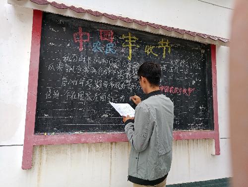 时维九月,序属三秋;兰蕙争妍,丹桂飘香。为了更好地迎接中国农民丰收节和中国传统文化节日中秋节,动漫狂 社会实践部副部长张焱和董宇前往新庄村开展“丰收与中秋 双节一起过”的黑板报绘制活动。
