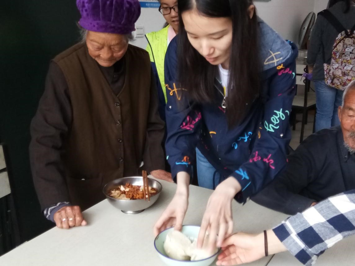 上午九点钟左右,志愿者们到达新庄村,他们先在村委会与村主任和村支书交流沟通,表达清楚了他们帮助留守老人的想法。村主任和村支书表示非常欢迎志愿者们的到来,十分感谢志愿者们来为老人们服务,做出贡献,并表示会竭尽全力帮助支持志愿者们完成工作,接下来由村子的副书记带领社践成员和志愿者们到达老人的家里。临近午饭时间,志愿者们来到餐厅打扫卫生,擦桌子、扫地、刷盆、洗碗,志愿者们一丝不苟,不多一会儿,就把卫生打扫的干干净净,让来到餐厅吃饭的老爷爷老奶奶们看到这么一尘不染心里特别高兴,脸上露出了幸福的微笑。然后志愿者们帮老人们端饭菜到餐桌上,帮助有困难的老人好好吃饭。