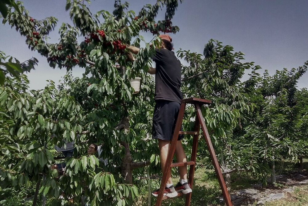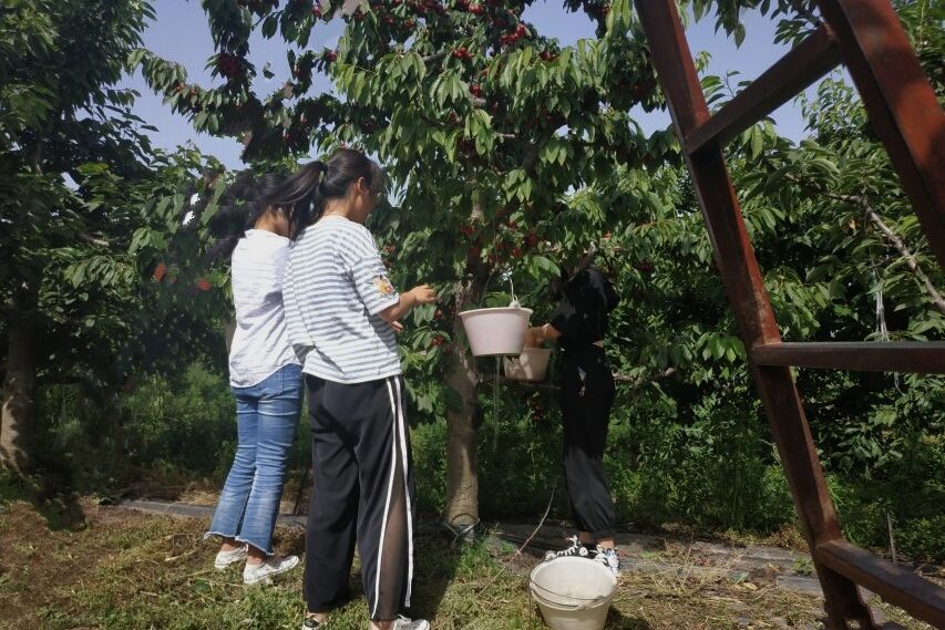 队员在采摘樱桃