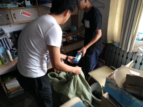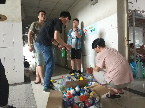 活动伊始,活动人员早早在6号楼一楼大厅集合完毕,等待着领导的安排。带队领导首先召集全体活动人员,介绍了这次义务劳动的意义,并将劳动任务分配给各组长。全体活动人员接到任务后,迅速投入到工作中。随后,大家分工明确、配合默契,各就其位,各司其职,有条不紊地进行劳动。活动如火如荼的进行着。由于宿舍空间狭小,使得挑拣塑料情工作有些困难,没过一会儿大家的脸上都布满了豆大的汗珠。然而,这一切丝毫没有影响他们的热情和工作效率。在各组组长的带领下,活动效率异常高涨,很快,众多废旧酒瓶就被大家收拾整理完成,宿舍面貌也焕然一新。大家无不被“众人拾柴火焰高”的工作效率所折服,这也在无形间验证了团结协作在项目运转中的重要性,同时更增加了大家之间的配合与默契程度,使大家坚信:只要同心协力,没有克服不了的困难。