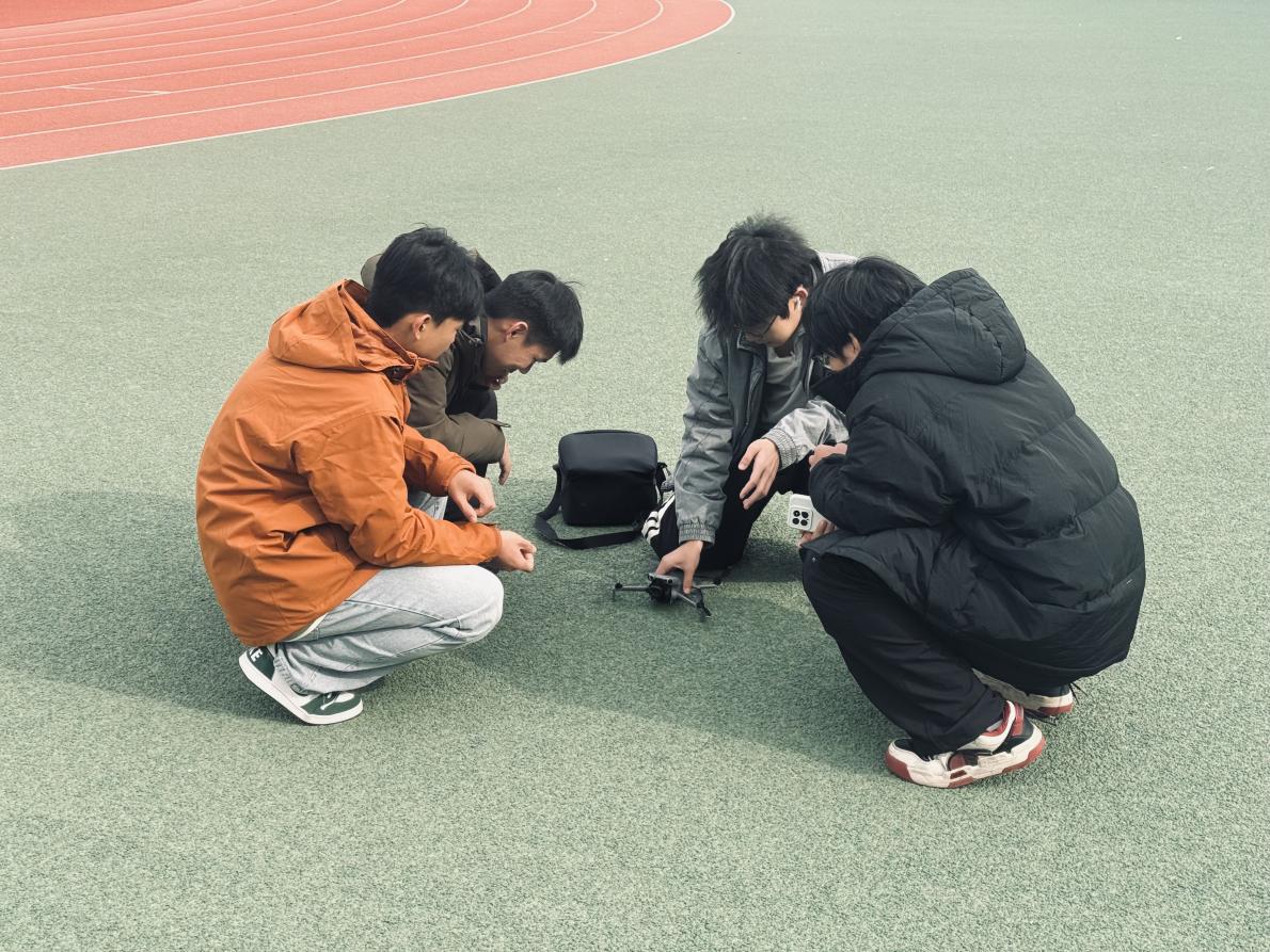 进入实操环节,运动场的开阔空间为训练提供了充足条件。在吴旭学长的安全监护下,同学们依次上手操作,完成了 “刷锅环绕” 等基础飞行动作的训练,从最初的摇杆操控生疏,到逐渐掌握飞行节奏,实操熟练度稳步提升。随后,孙培杰同学进行了手动降落的专项演示:他操控无人机悬停至合适高度后,通过微调油门与方向杆,让设备平稳落在指定区域,同时同步讲解了 “逆风降速”“低电量应急降落” 等实用技巧,为大家厘清了实操中的安全与精准要点。