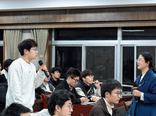 她从“二十大对法治中国建设的部署”、“习近平法治思想的形成过程”、“习近平法治思想的主要内容”、“习近平法治思想的逻辑体系”四个方面分析讲述了习近平法治思想的核心要义。授课过程中,现场互动频频:一名同学结合团学工作实际,提问“青年如何在日常中践行法治思想”,张丽副教授以“从遵守规则到主动普法”为例,给出了生动的回应。这场团课既有理论深度,又贴近青年视角,让法治思想真正入脑入心。通过习近平法治思想相关知识的学习,提升了我们的法治认知水平,增强了对中国特色社会主义法治道路的认同与自信。