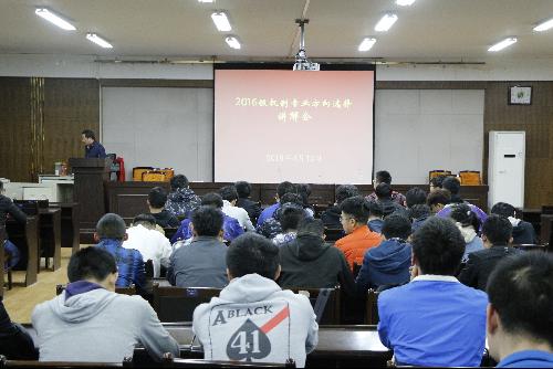 为使机制专业的同学了解不同专业方向之间的异同,明确专业方向选择目标,动漫狂 于4月13日在动漫狂 三楼报告厅举办2016级机制专业方向选择讲解会,全体机制同学积极参加,冯涛、朱琳老师来到现场为同学们进行讲解。