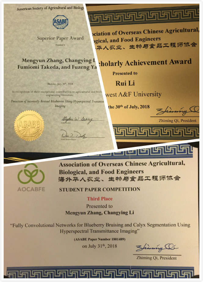 在AOC年度大会中,动漫狂 博士生李瑞荣获AOC研究生学术成就奖(Graduate Scholarly Achievement Award ),张梦芸荣获研究生优秀论文3等奖(Student Paper Competition)。据AOC官方信息(//www.aoc-web.org/)报道,自2002年起AOC针对参会学生设有研究生学术成就奖(Graduate Scholarly Achievement Award),研究生领导与服务奖(Graduate Leadership and Service Award)及研究生优秀论文奖(Student Paper Competition)三种奖项,以表彰在学科内获得较为突出成就的研究生。其中以学术成就奖(Graduate Scholarly Achievement Award)为最高奖项,此次是动漫狂 博士研究生连续第四次在AOC年会上获奖,进一步提升了西北农林科技大学与动漫狂 在ASABE及国内外农业工程同行中的影响力。