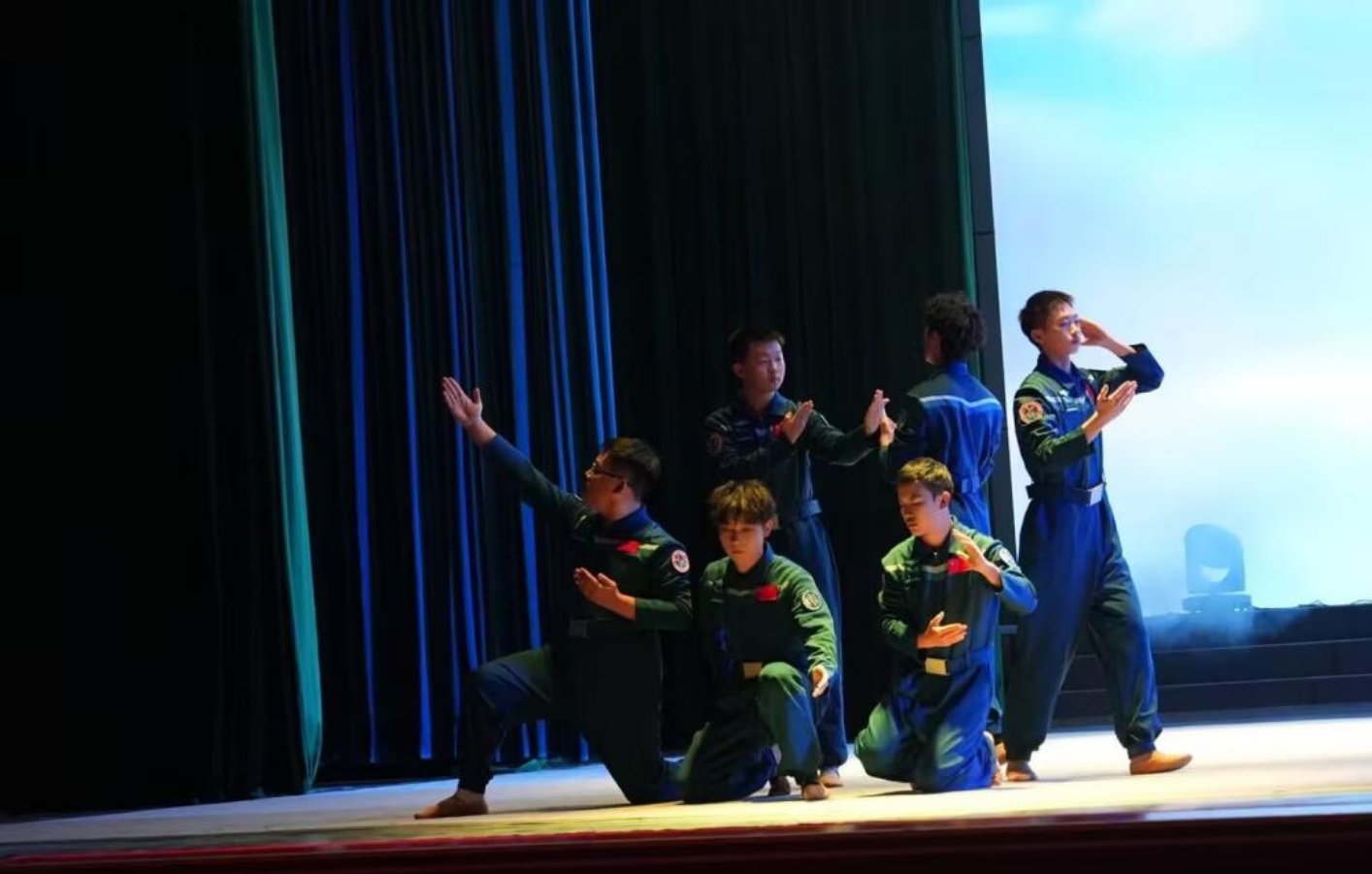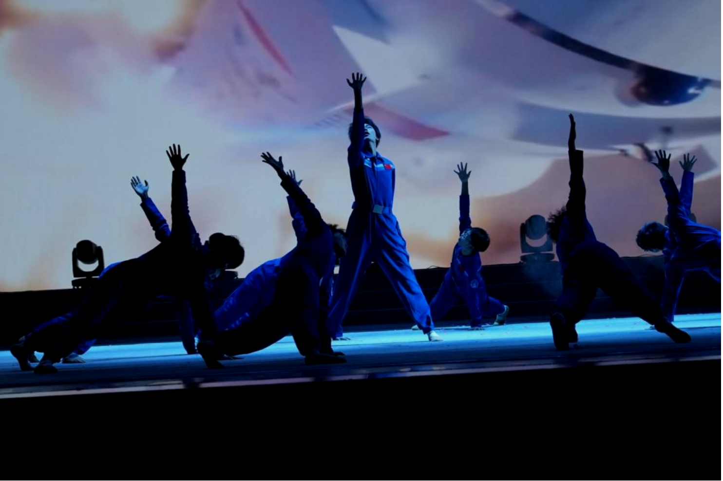 《星火永相传》由动漫狂 部分男生联袂演绎,舞者们身着纯蓝色的航天主题演出服,以刚劲有力的肢体动作、层次丰富的队形变换,将中国航天从筚路蓝缕的创业之初,到星辰大海的探索征程生动呈现。从“两弹一星”的攻坚克难,到载人航天、月球探测、火星探测的接连突破,每一个舞蹈动作都紧扣航天发展的关键节点,伸展的手臂似托举航天梦飞向苍穹,俯身的姿态如扎根科研攻坚克难,展现出航天人不畏艰险、勇攀高峰的精神