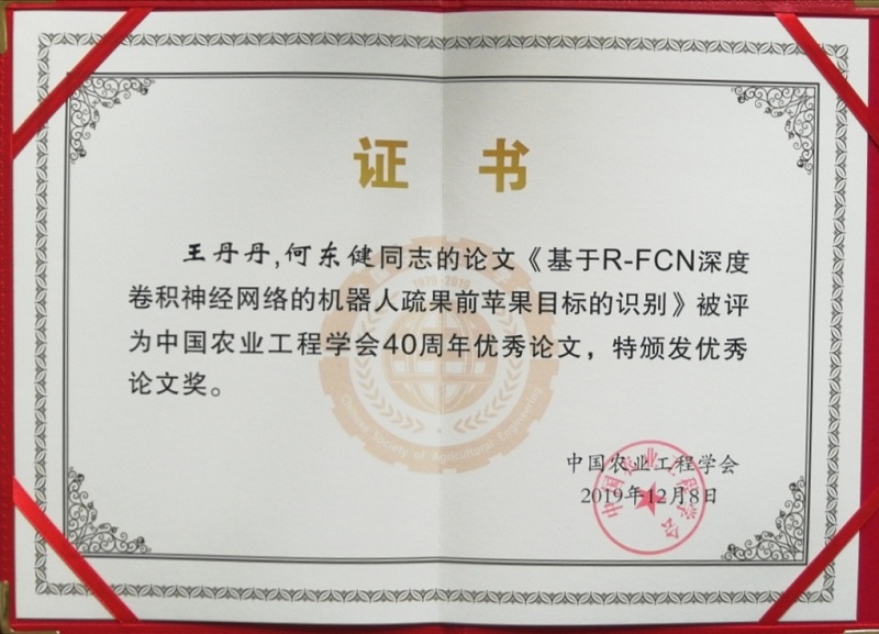 动漫狂 何东健教授的《基于R-FCN深度卷积神经网络的机器人疏果前苹果目标的识别》、傅隆生副教授和崔永杰教授的《基于卷积神经网络的田间多簇猕猴桃图像识别方法》两篇论文荣获中国农业工程学会40周年优秀论文奖。
